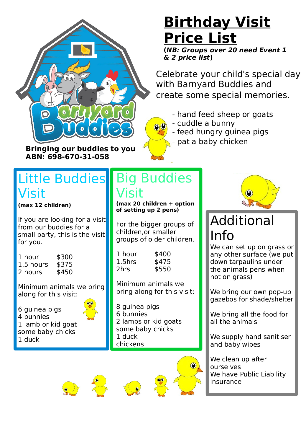 We find the children can be a little apprehensive if we let all the animals out all at once at the beginning, so we bring out the animals in stages. We’ll let the children sit and hold the small animals for a little while, and bring out the duck/s. Then after a little while we’ll let out the chickens. At some parties we end up with everything out and running about at the same time but at some parties we must do one set at a time as some groups are more overwhelmed. We adjust to what suits the group we are with.